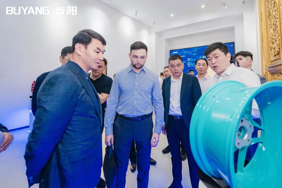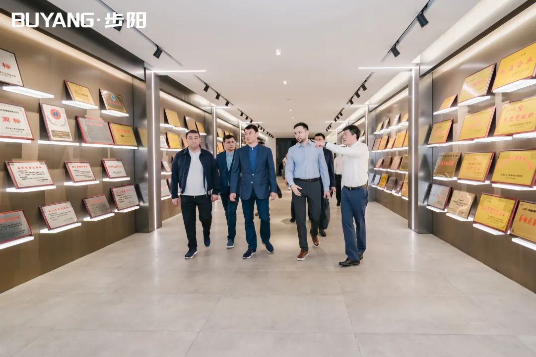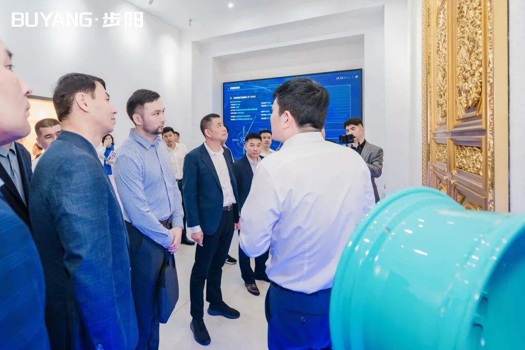 圖爾克斯坦州州長一行在集團(tuán)徐步云董事長的陪同下參觀了步陽科技館、汽輪/大數(shù)據(jù)中心,步陽工匠室、5G智能流水線,并聽取公司科技創(chuàng)新、生產(chǎn)自動(dòng)化的介紹解說。