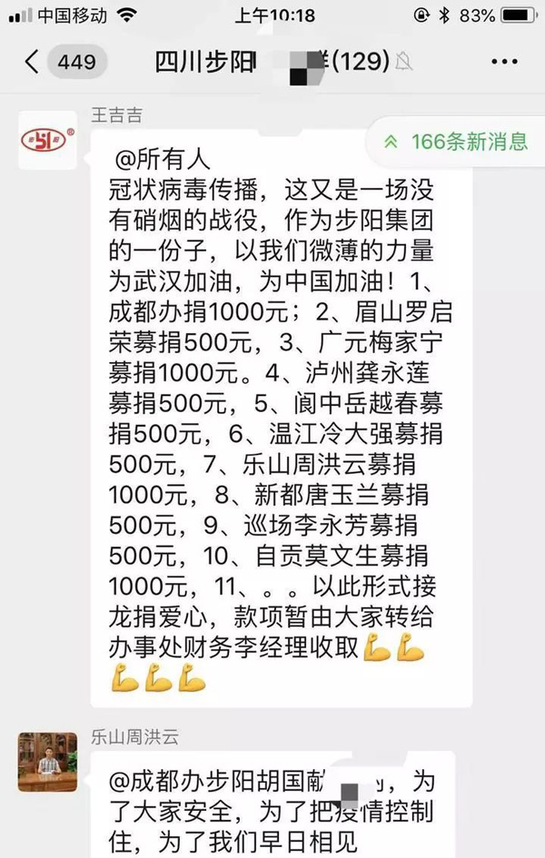 2月1日,步陽(yáng)銷售工作微信群內(nèi)活躍異常,引爆熱點(diǎn)的關(guān)鍵僅僅是一句話:“新型冠狀病毒傳播,這是一場(chǎng)沒有硝煙的戰(zhàn)役,作為步陽(yáng)集團(tuán)一份子,以我們微薄的力量吶喊加油!”鄭州、濟(jì)南、合肥、成都、福州等全國(guó)26個(gè)銷售分公司立即響應(yīng),紛紛開始自發(fā)組織捐款,參與人數(shù)超過2100多人。不到半天,來(lái)自各個(gè)分公司的捐款已經(jīng)達(dá)到130萬(wàn)元。