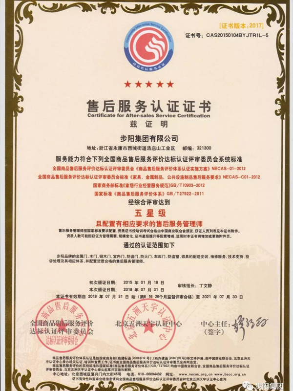 近日,在"全國商品售后服務(wù)體系項(xiàng)目"專家組評審中,步陽集團(tuán)有限公司在金屬門、木門、鋼木門、室內(nèi)門、防盜門、防火門、車庫門、防盜窗、鎖具的配送安裝、維修服務(wù)、技術(shù)支持、投訴處理及其相應(yīng)體系在內(nèi)的全程售后服務(wù)內(nèi)容,并配置資質(zhì)合格的售后服務(wù)管理師,順利通過了國家級4大評審標(biāo)準(zhǔn),綜合評審達(dá)到“五星級”!