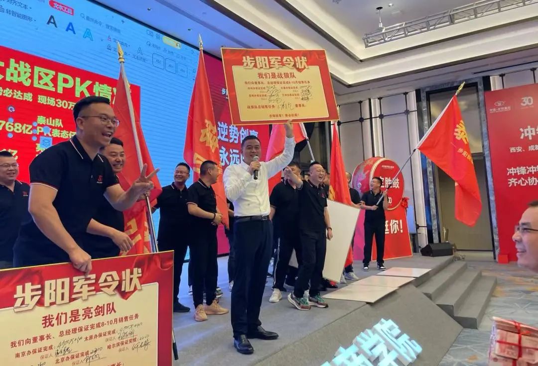 8月12日,以“全力沖鋒,決戰(zhàn)八九十”為主題的步陽商學(xué)院總裁班隆重舉辦。徐步云董事長在第五期步陽商學(xué)院總裁班指出,2022下半年機(jī)遇與挑戰(zhàn)并存,動(dòng)力與壓力同在,步陽鐵軍要實(shí)現(xiàn)銷量突破,就要走出舒適區(qū),以全新的營銷理念和全新的PK模式,全力沖鋒完成全年銷售任務(wù)。